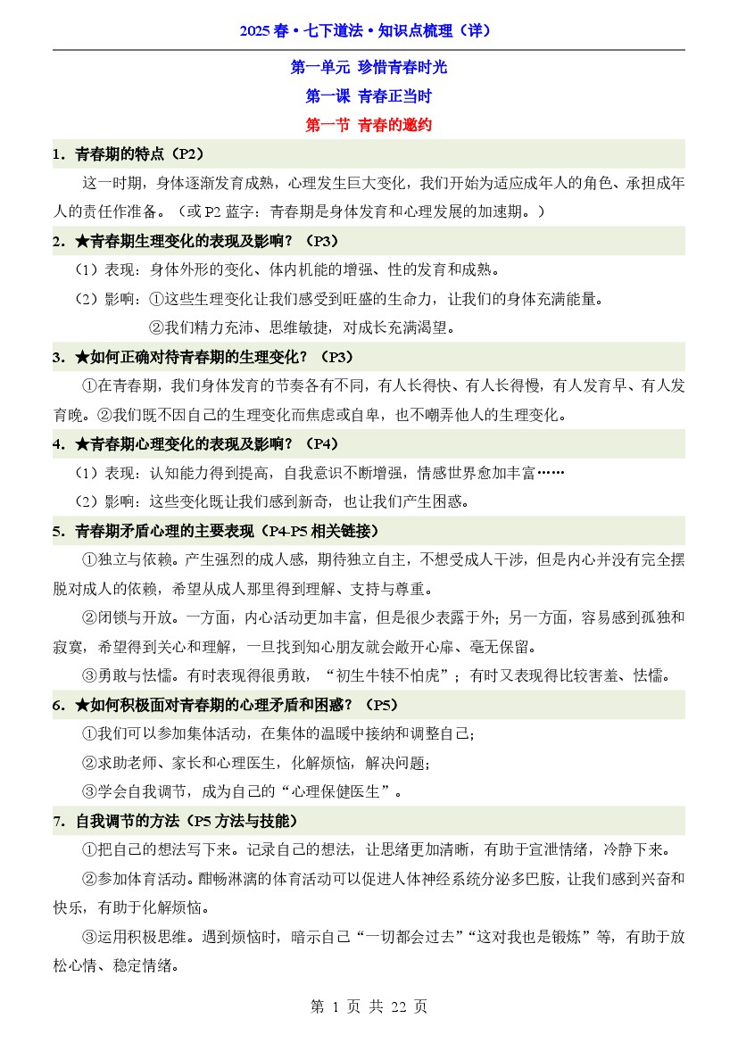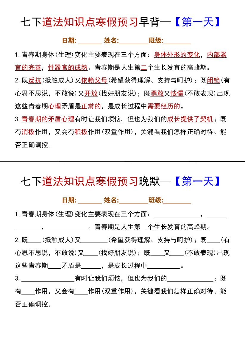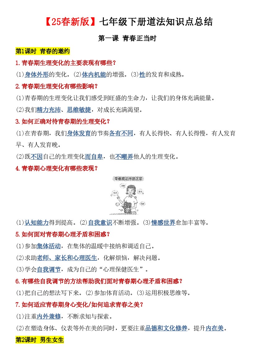 【2025春新版】七下道法知识点寒假预习早背晚默