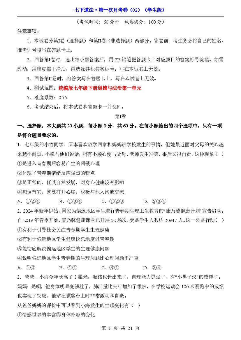 2025年七下道法第一次月考试卷7下道法第1次月考02【第1单元】