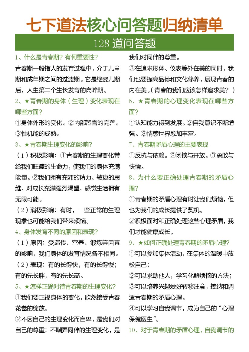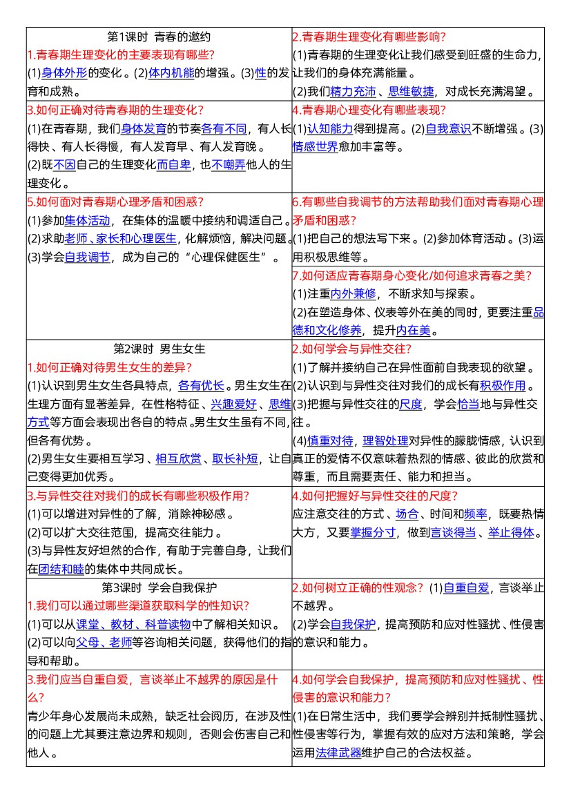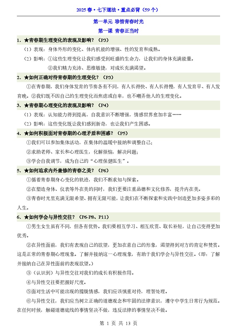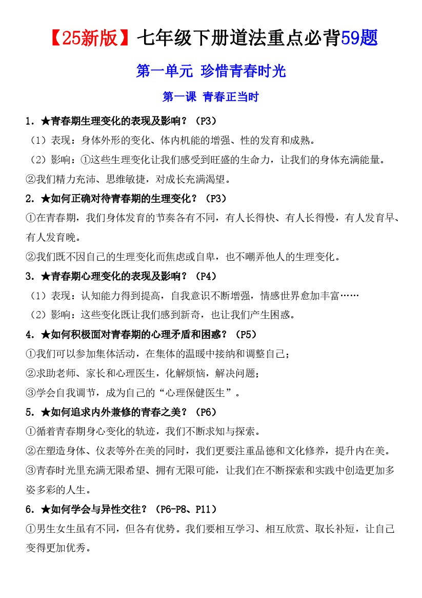 【25新版】七年级下册道法重点必背59题(背诵版)