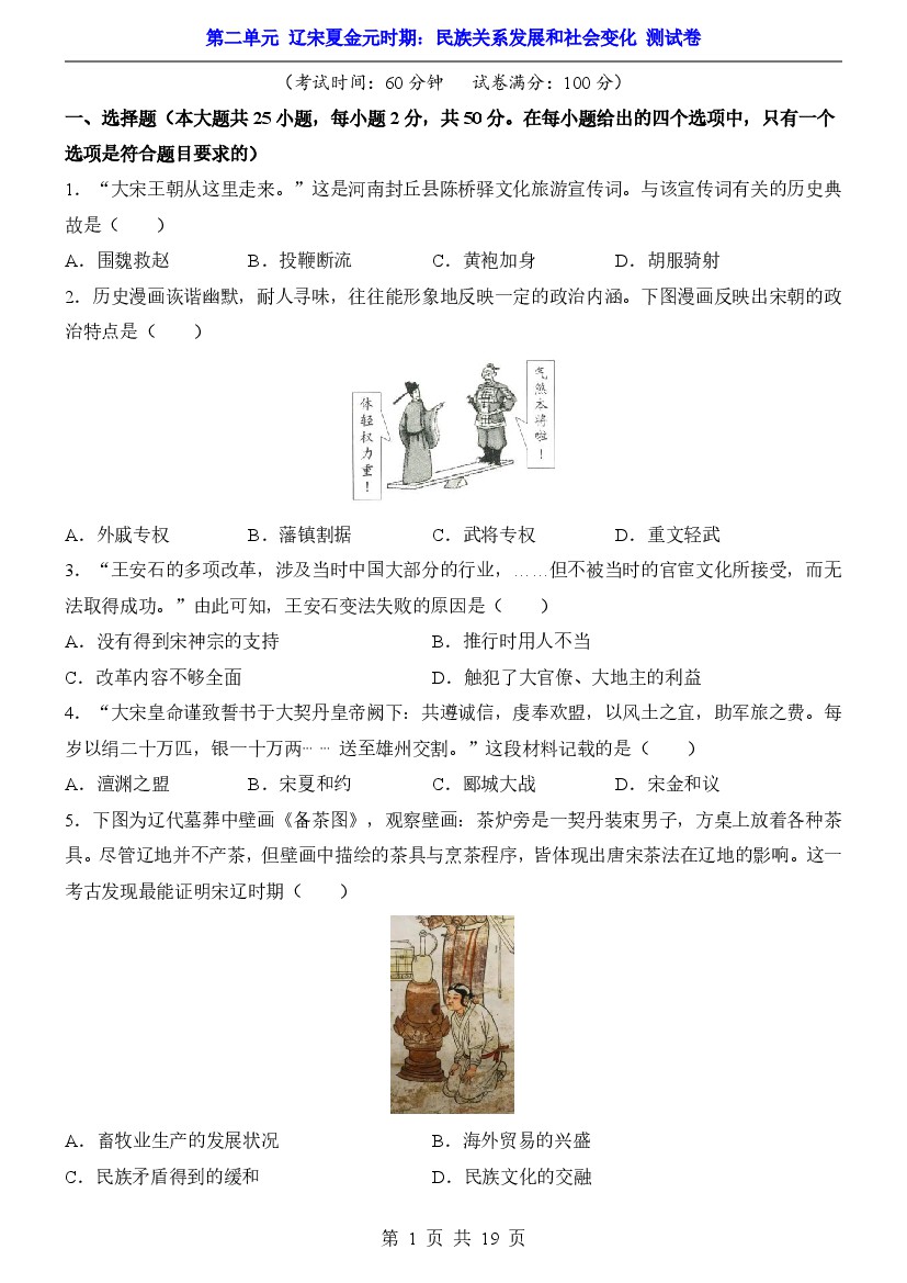 2025年【七下历史】单元测试卷第2单元辽宋夏金元时期(测试卷)