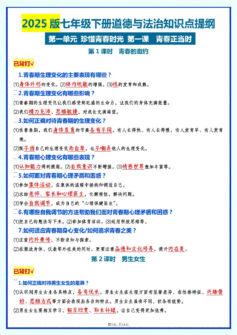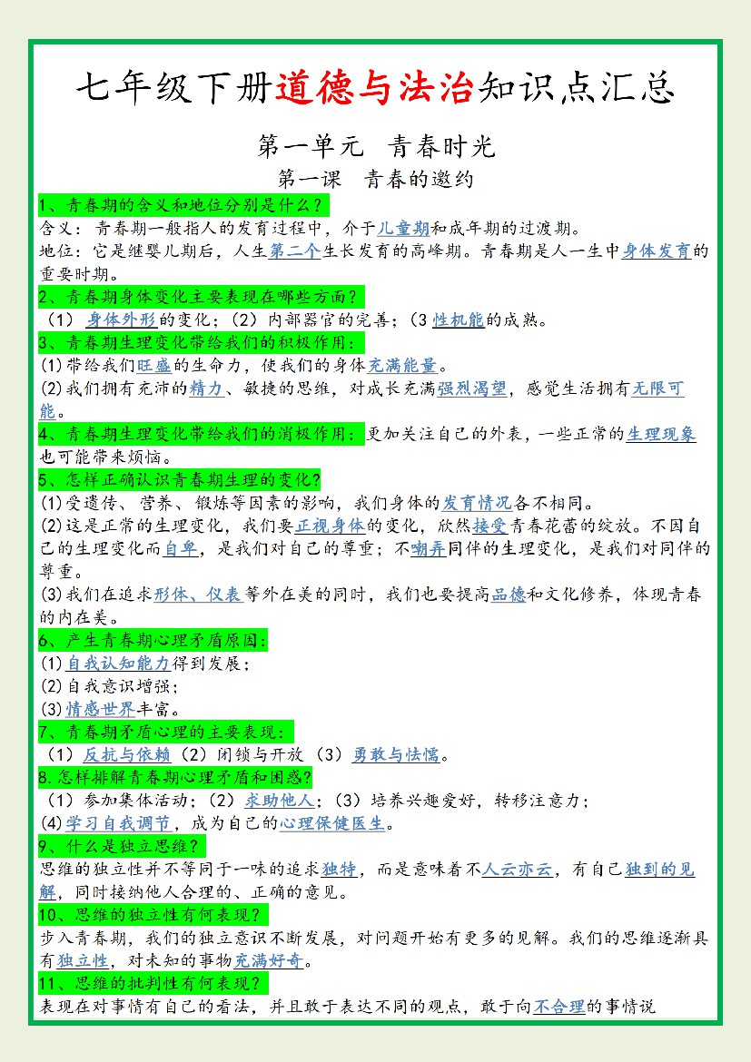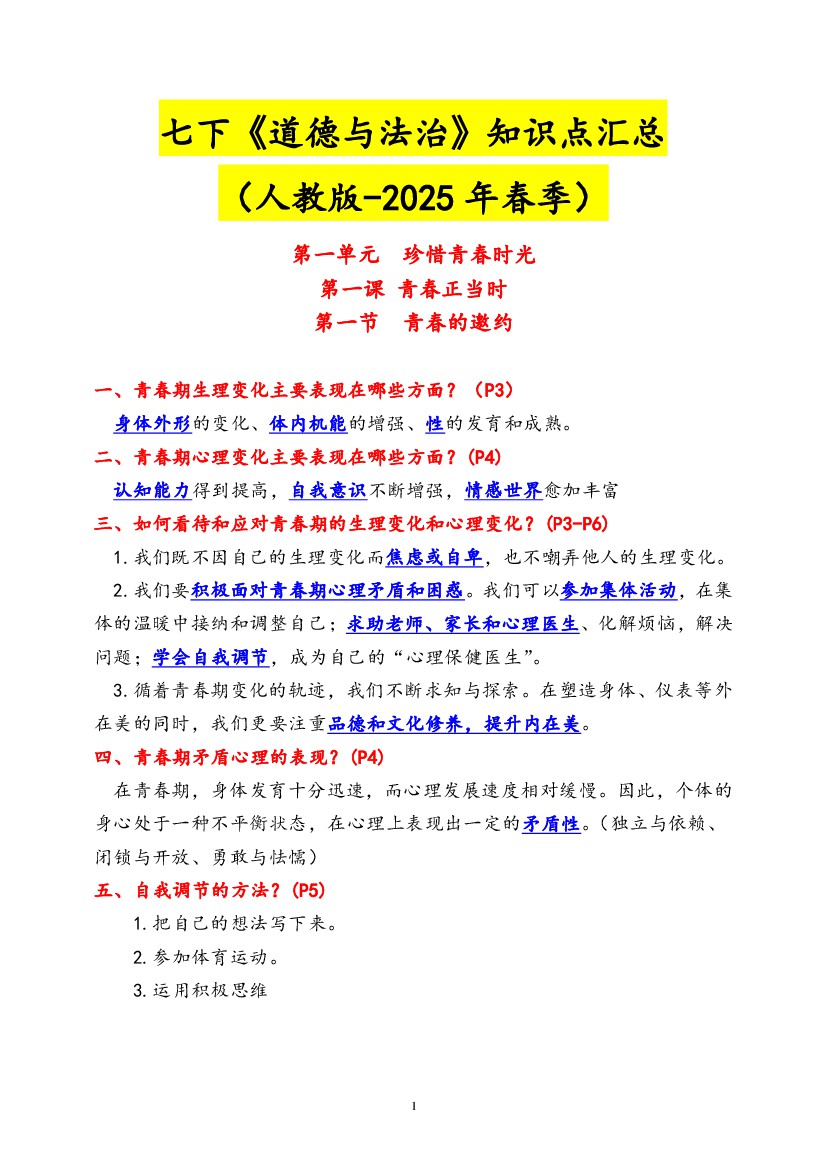 【2025春新版】7下道法-知识点汇总