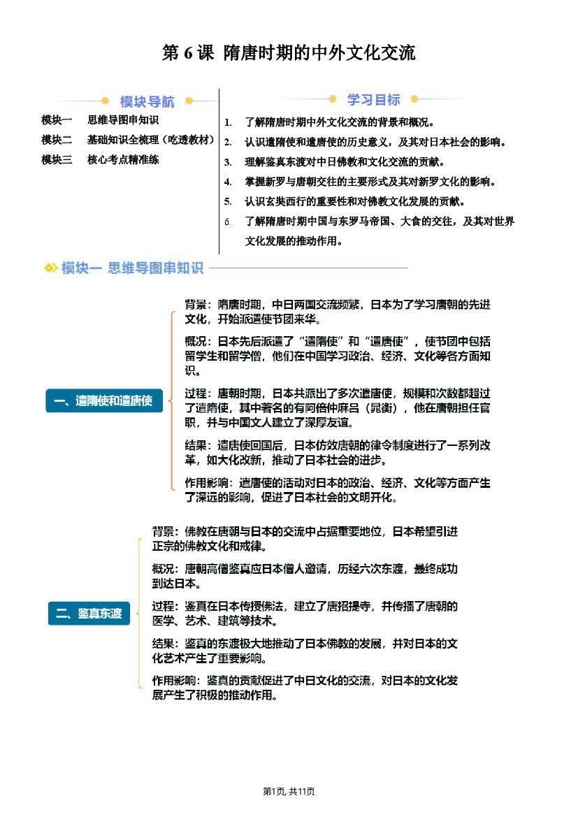【七下历史】新七下第6课隋唐时期的中外文化交流(原卷版)