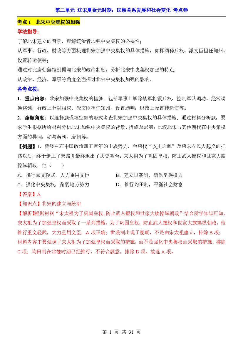 2025年【七下历史】单元测试卷第2单元辽宋夏金元时期(考点卷)