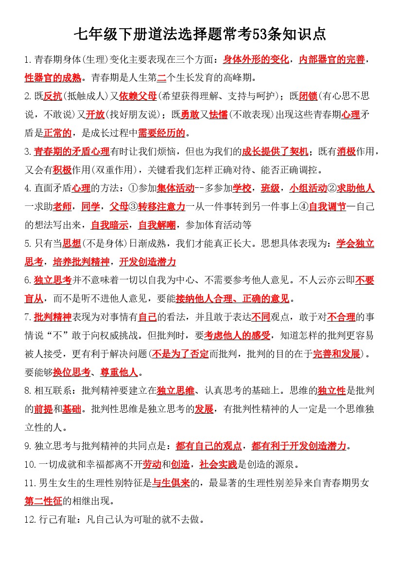 七年级下册道法期末选择题常考53条知识点