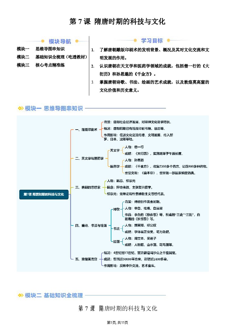 【七下历史】新七下第7课隋唐时期的科技与文化(原卷版)