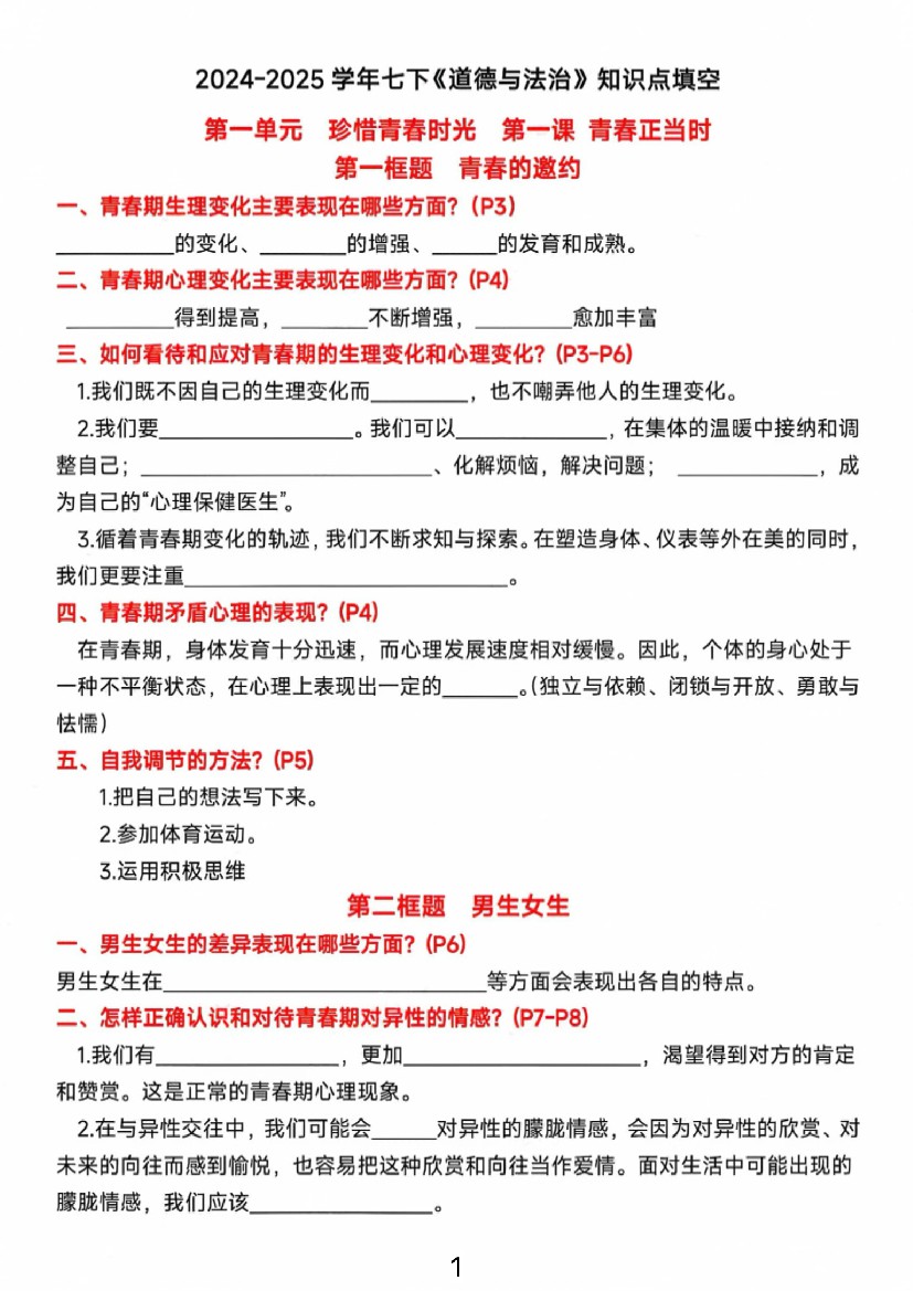 【25春】人教版七年级下册道德与法治期末复习《全册重要知识点默写填空》专项练习