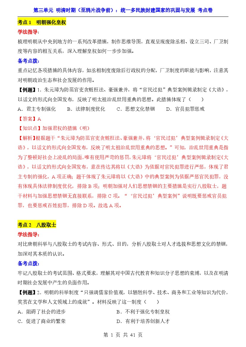 2025年【七下历史】单元测试卷第3单元明清时期(至鸦片战争前)(考点卷)