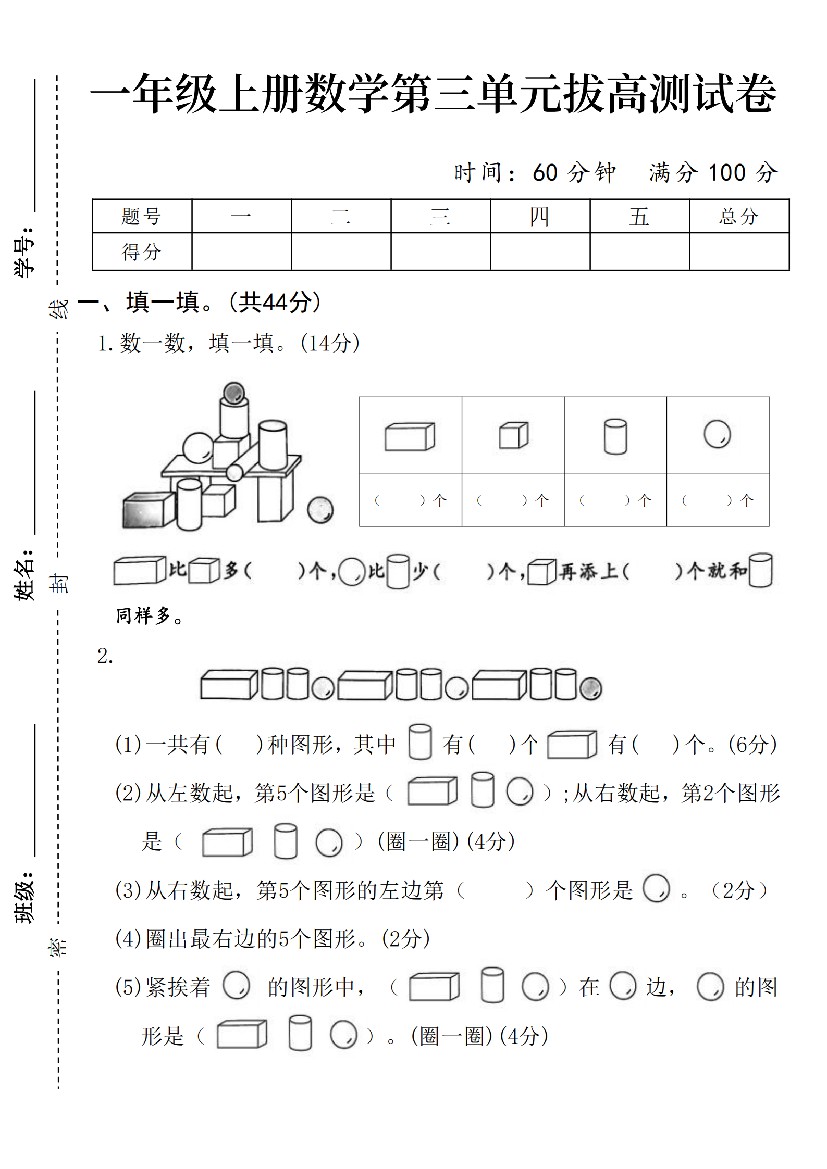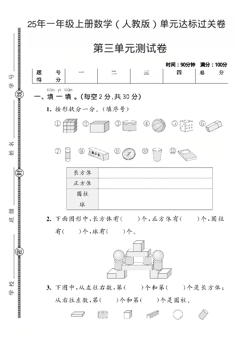 25年一年级上册数学(人教版)第三单元达标过关卷