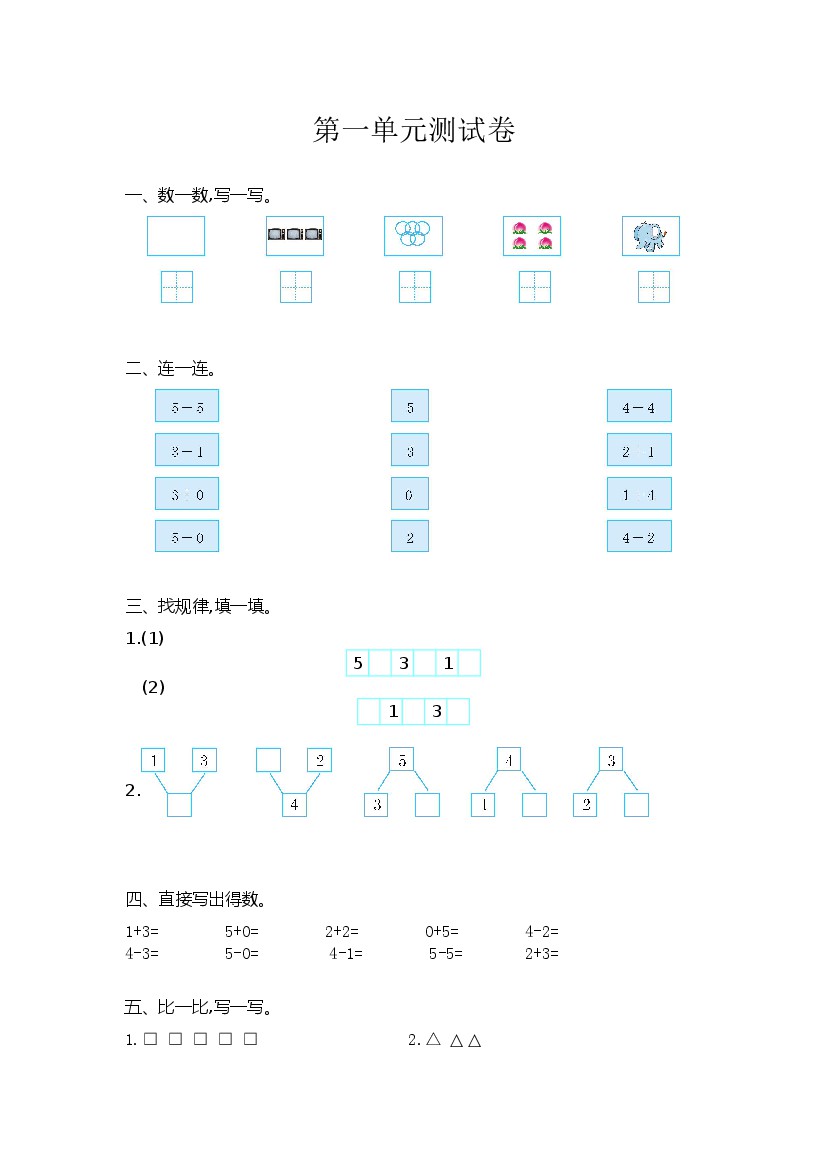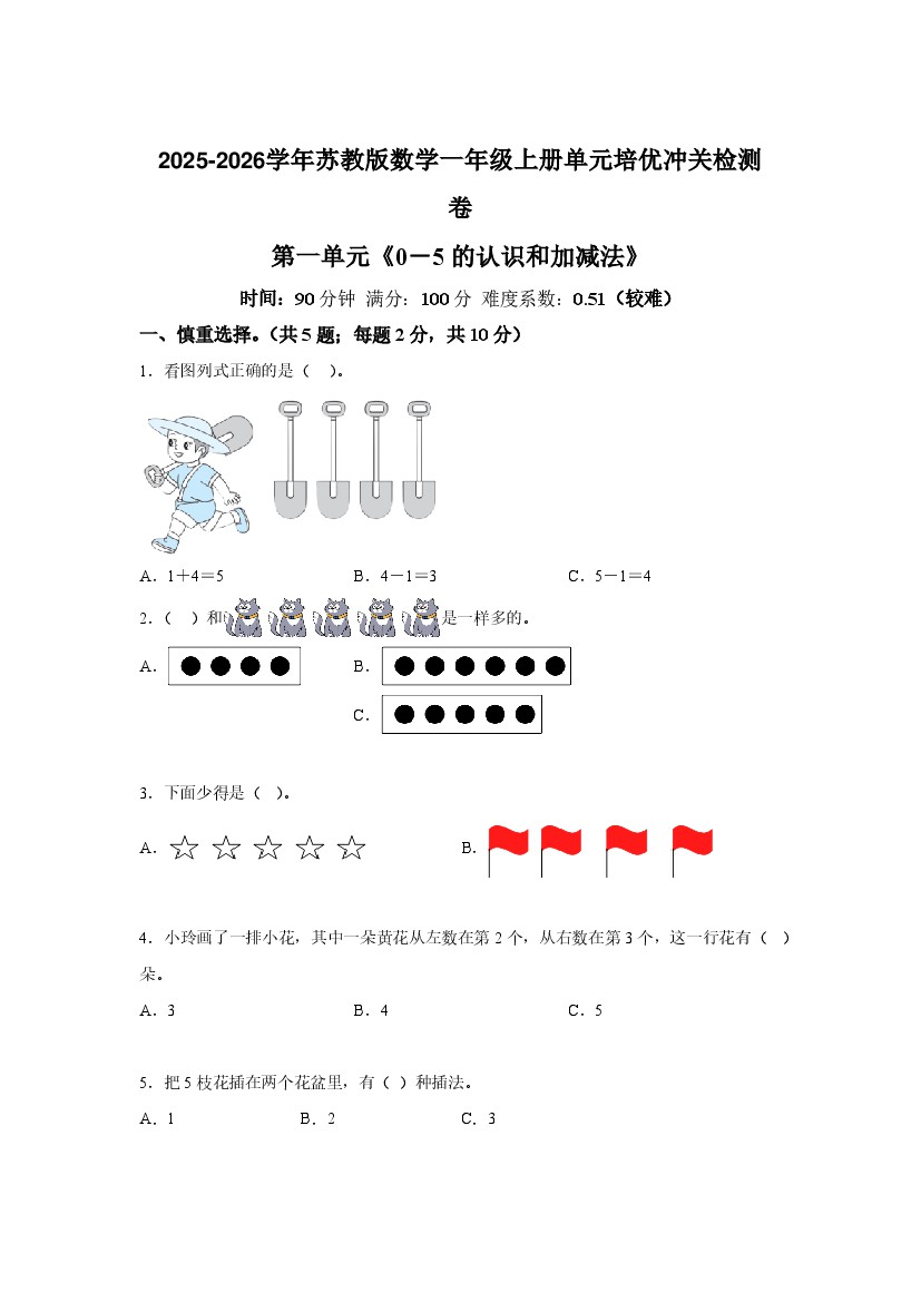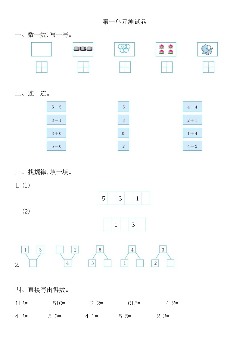 苏教版数学一年级上册第一单元《0-5的认识和加减法》培优冲关检测卷(1)
