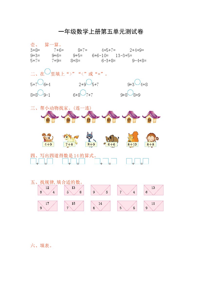 一上数学(西师版)一(上)西师版数学第五单元测试卷