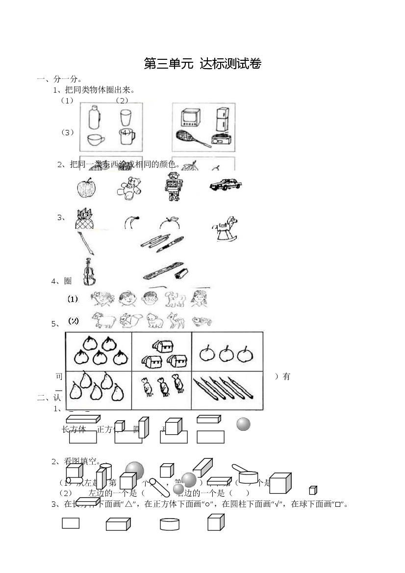 一上数学(西师版){1} - 西师大版数学一年级上册第一单元测试卷