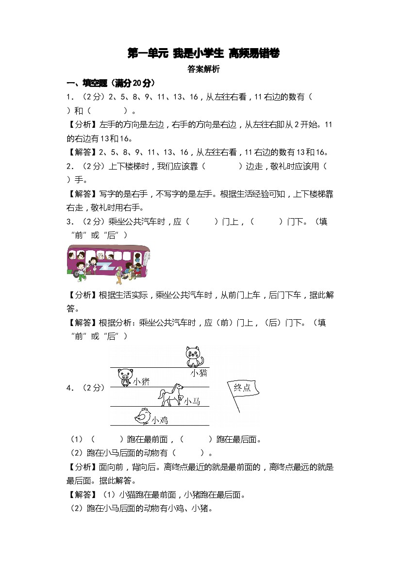 【沪教】一上数学(易错卷)第一单元 我是小学生 高频易错卷-(答案教师)(沪教版)