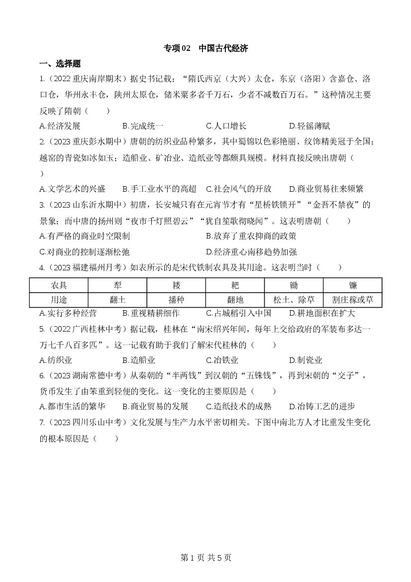 2025年七下历史专项练习专项02中国古代经济