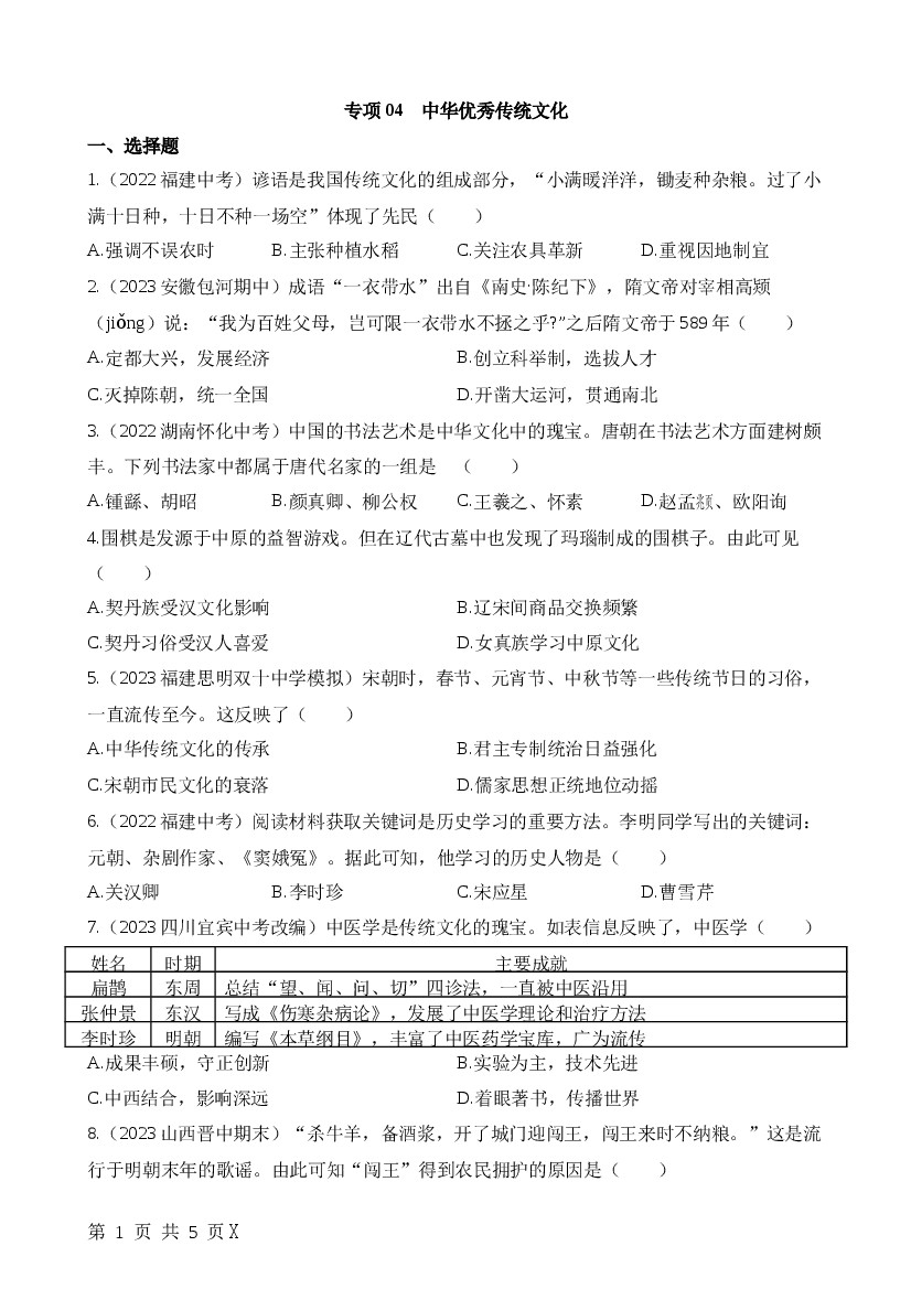 2025年七下历史专项练习专项04中华优秀传统文化