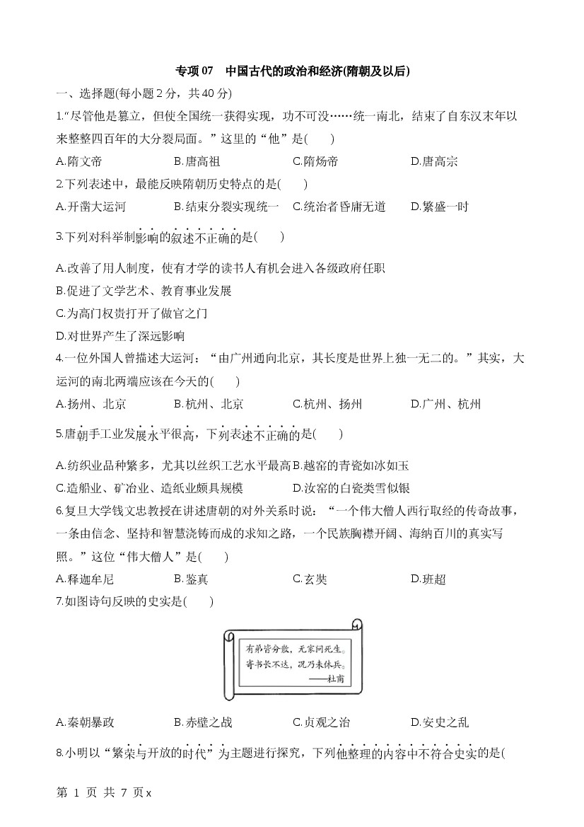2025年七下历史专项练习专项07中国古代的政治和经济