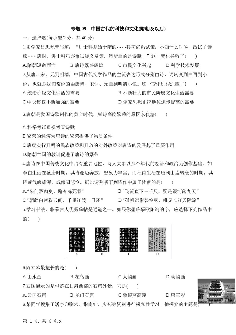 2025年七下历史专项练习专项09中国古代的科技和文化