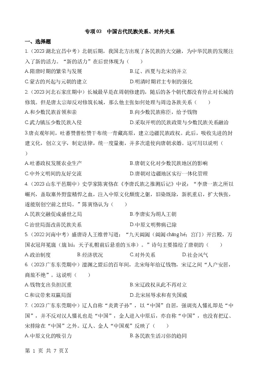2025年七下历史专项练习专项03中国古代民族关系、对外关系