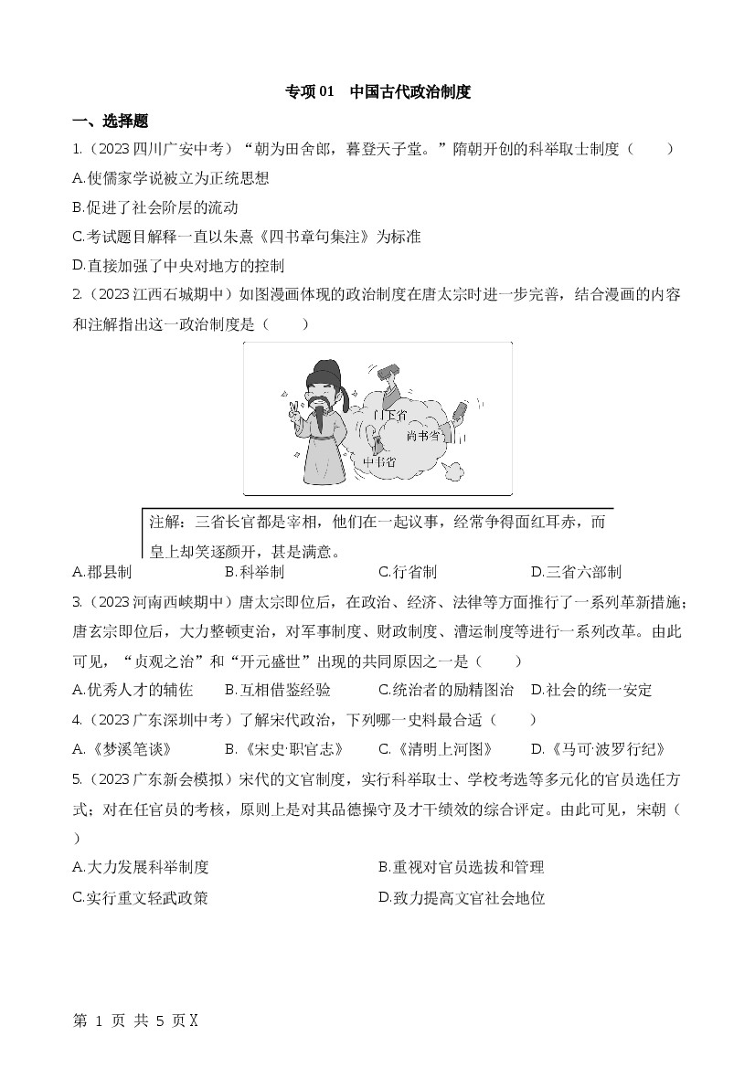 2025年七下历史专项练习专项01中国古代政治制度