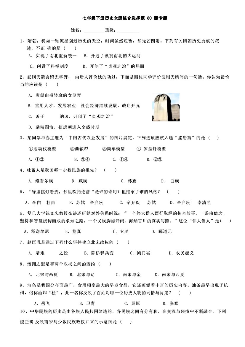 人教版七年级下册历史期末复习《选择题》综合专项练习(含答案)