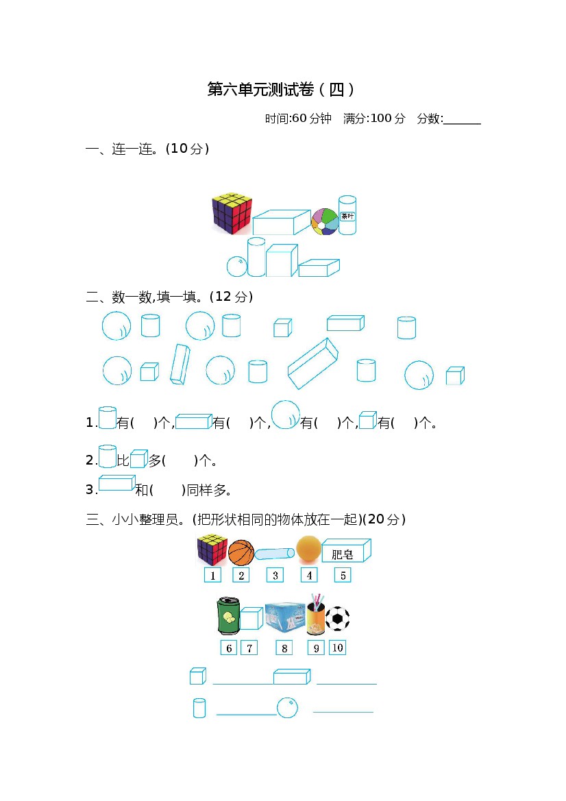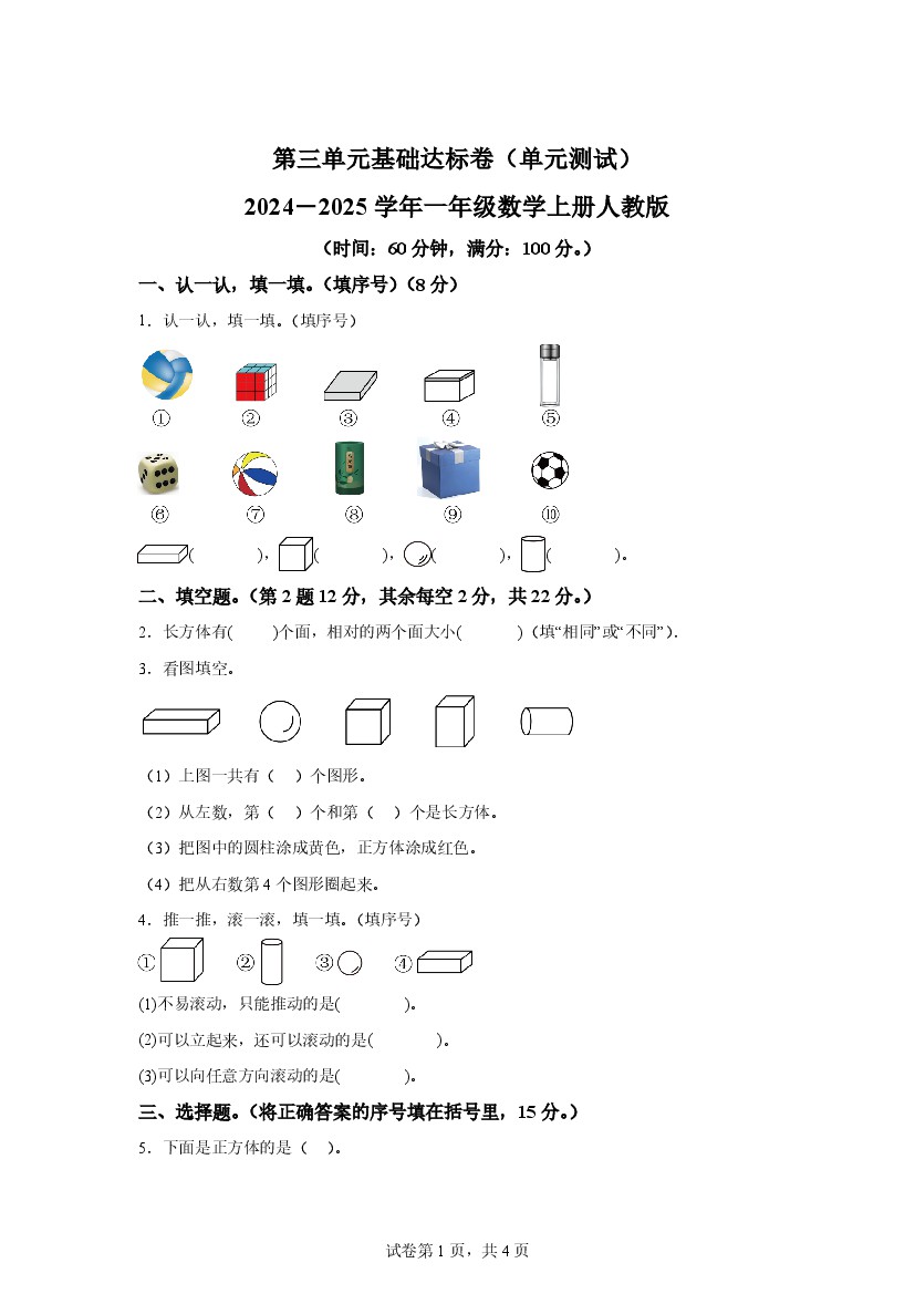 人教版数学一年级上册第三单元《认识立体图形》单元测试卷