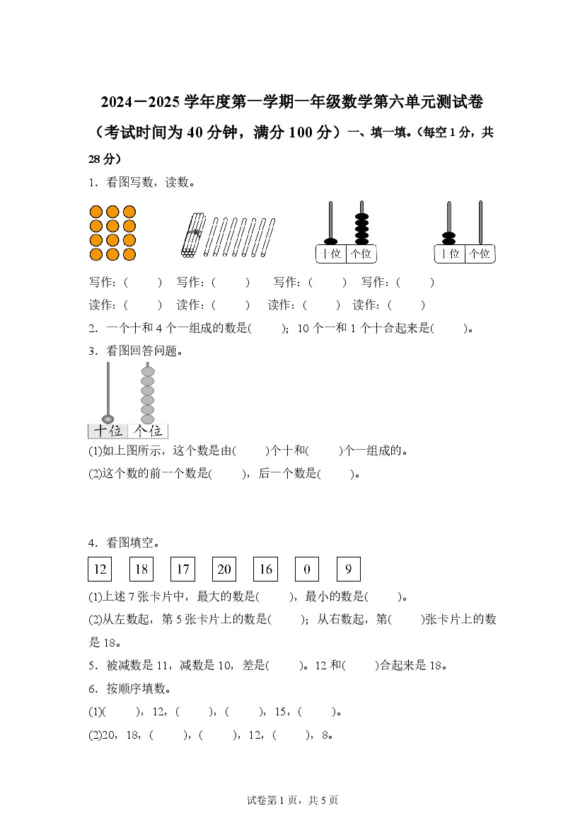 人教版数学一年级上册第六单元《复习与关联》单元测试卷