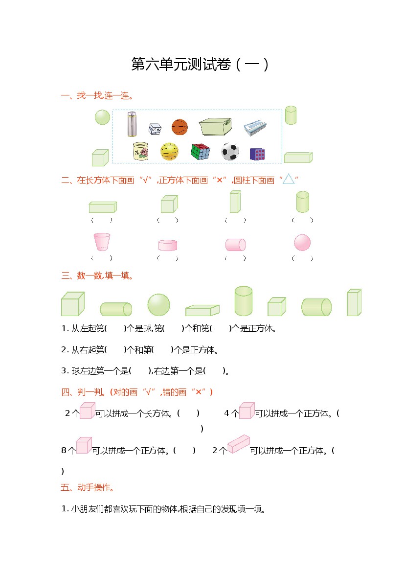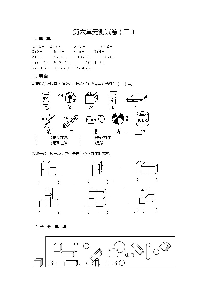 人教版数学一年级上册第二单元《6~10的认识和加、减法》单元测试卷
