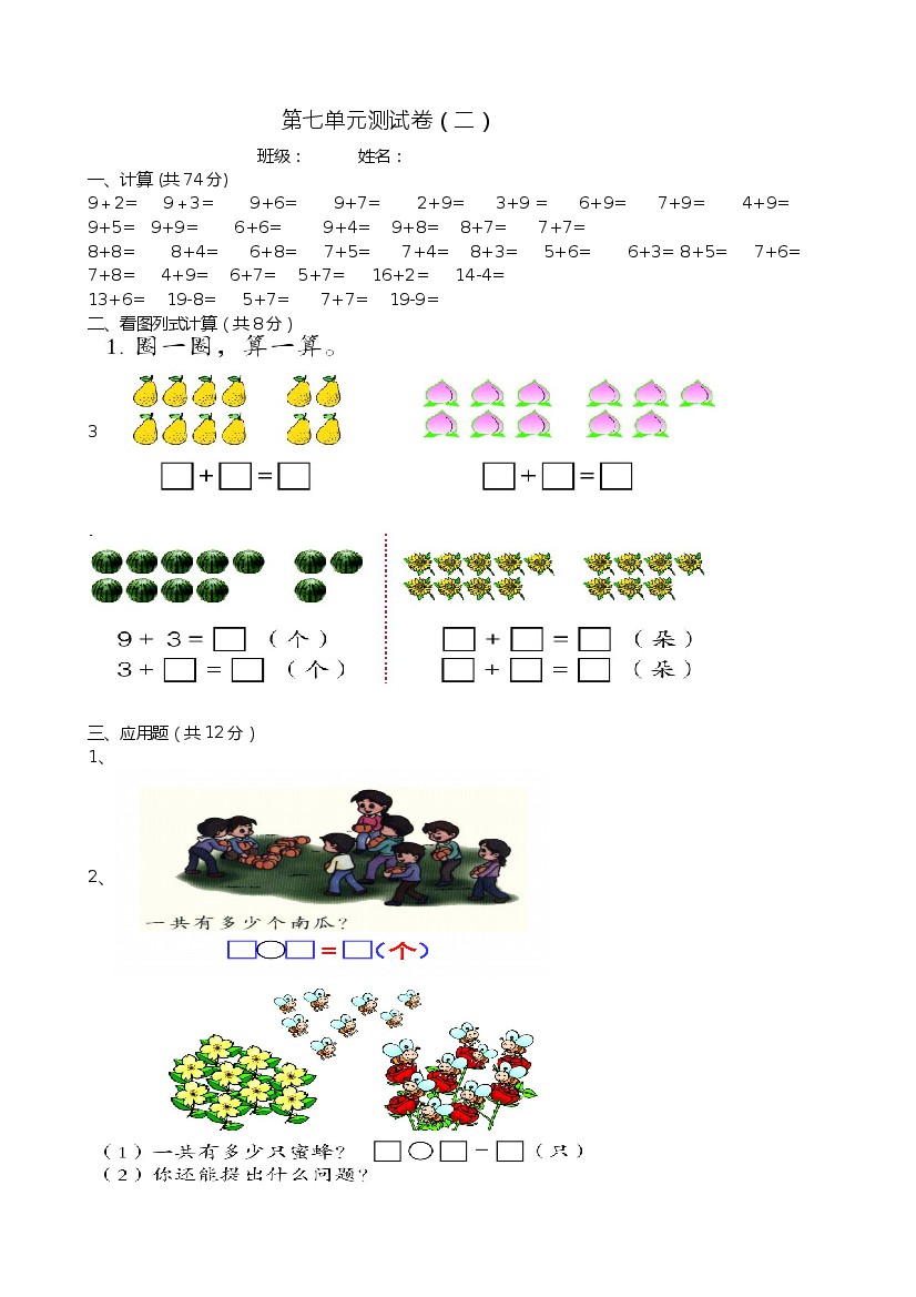 一上数学(西师版){7} - 一(上)西师版数学第三单元测试卷