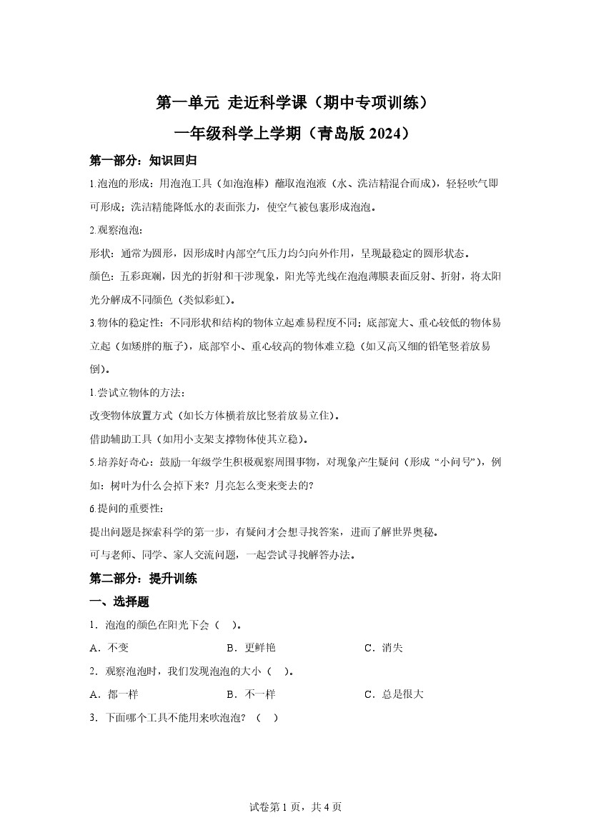 第一单元 走进科学课(期中专项训练)一年级科学上学期(青岛版·新教材)
