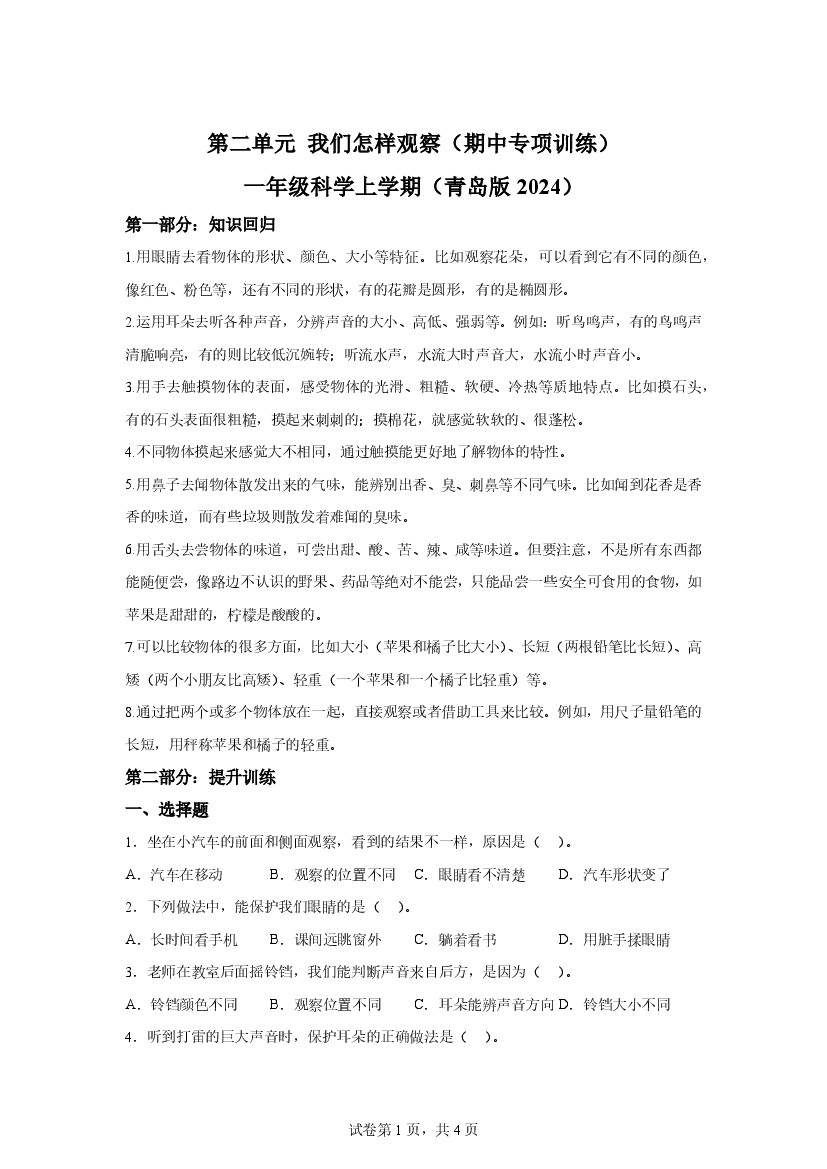 第二单元 我们怎样观察(期中专项训练)一年级科学上学期(青岛版·新教材)