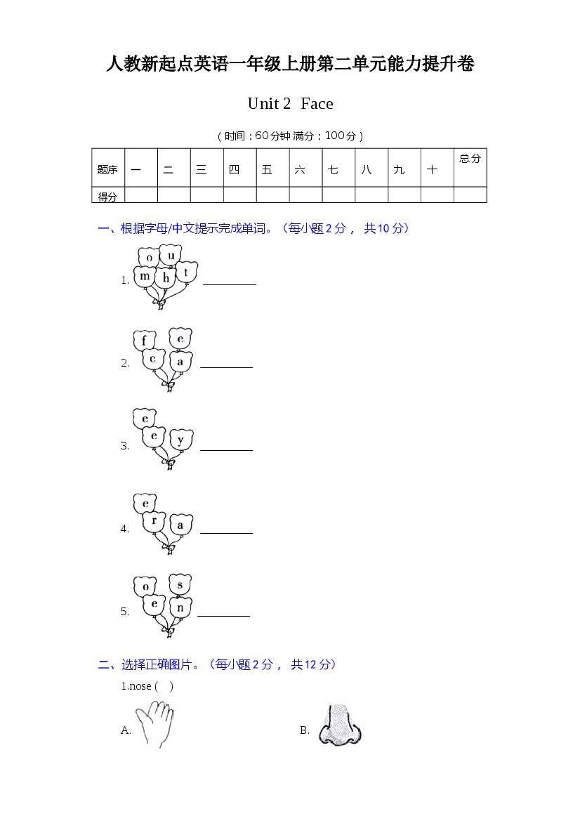 一上英语(人教版)(02)--第二单元能力提升卷-Unit 2 Face