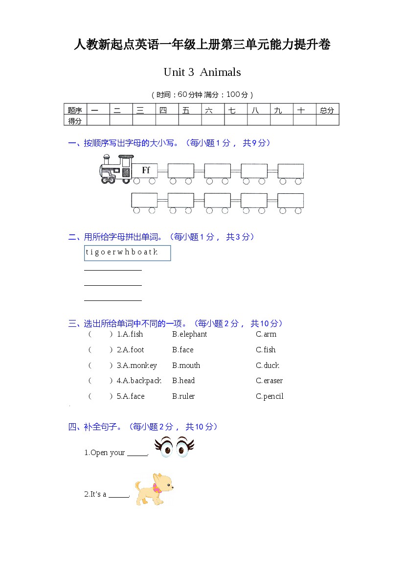 一上英语(人教版)(03)--第三单元能力提升卷-Unit 3 Animals
