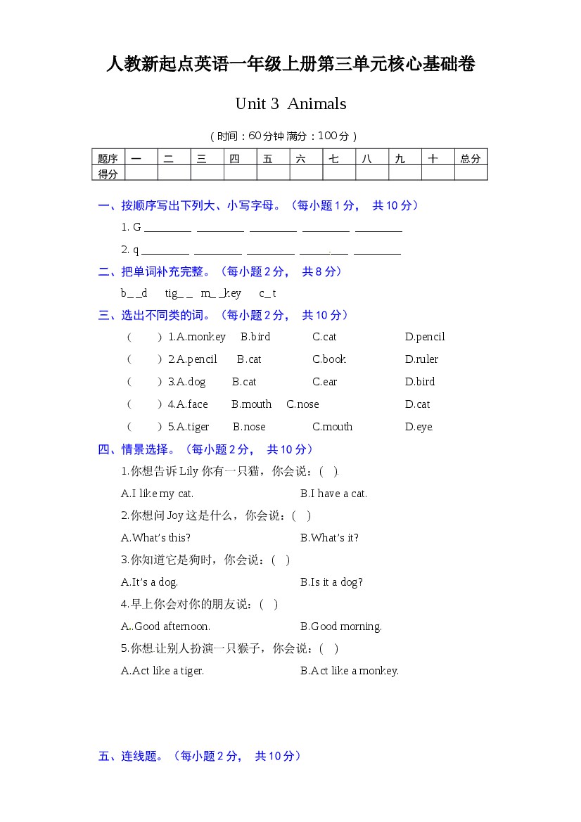 一上英语(人教版)(03)--第三单元核心基础卷-Unit 3 Animals