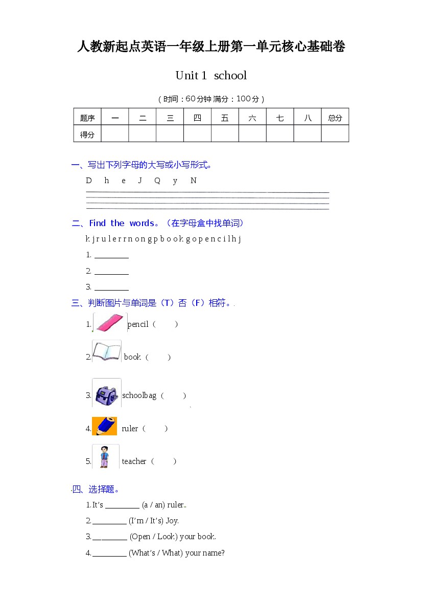 一上英语(人教版)(01)--第一单元核心基础卷-Unit 1 School