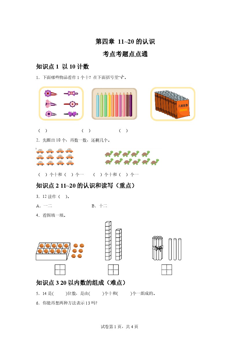25新一年级数学人教第四章 11~20的认识考点考题点点通