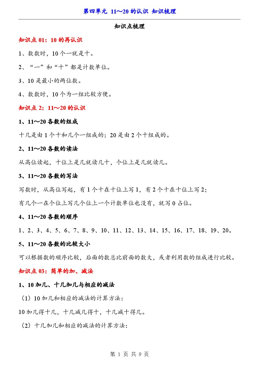 第五单元 认识11~19(知识清单)-(苏教版·2025秋)