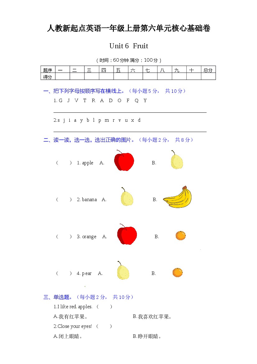 一上英语(人教版)(06)--第六单元核心基础卷-Unit 6 Fruit
