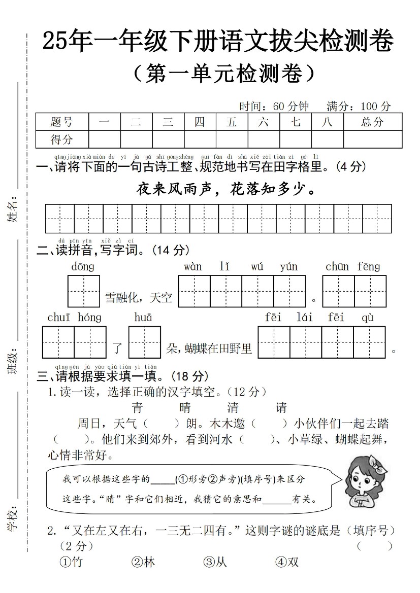 2025年春一下语文第一单元拔尖检测卷-春天(含答案5页)