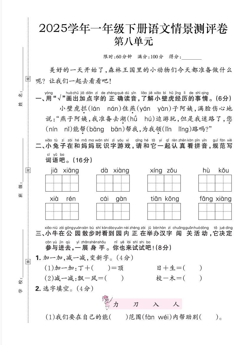 【24-25一下语文期末素养测评基础卷一(含答题卡+答案14页)