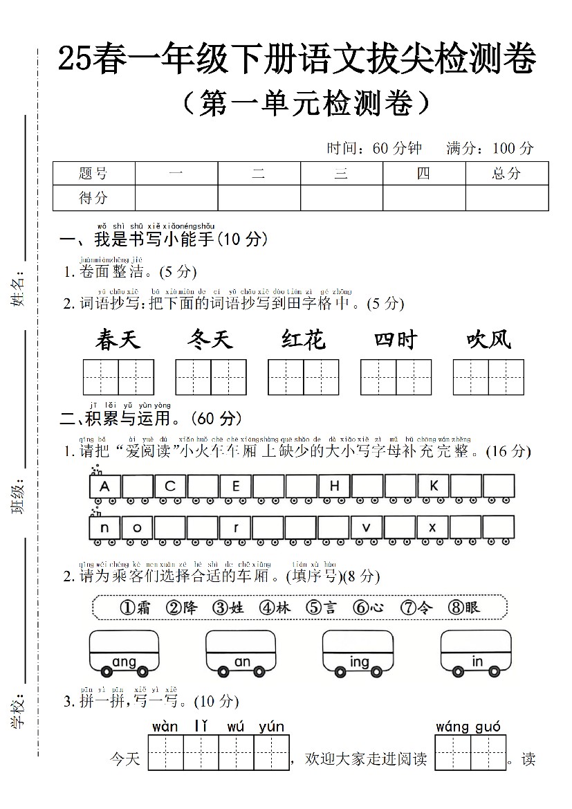 2025年春一下语文第一单元拔尖检测卷-词语抄写春天