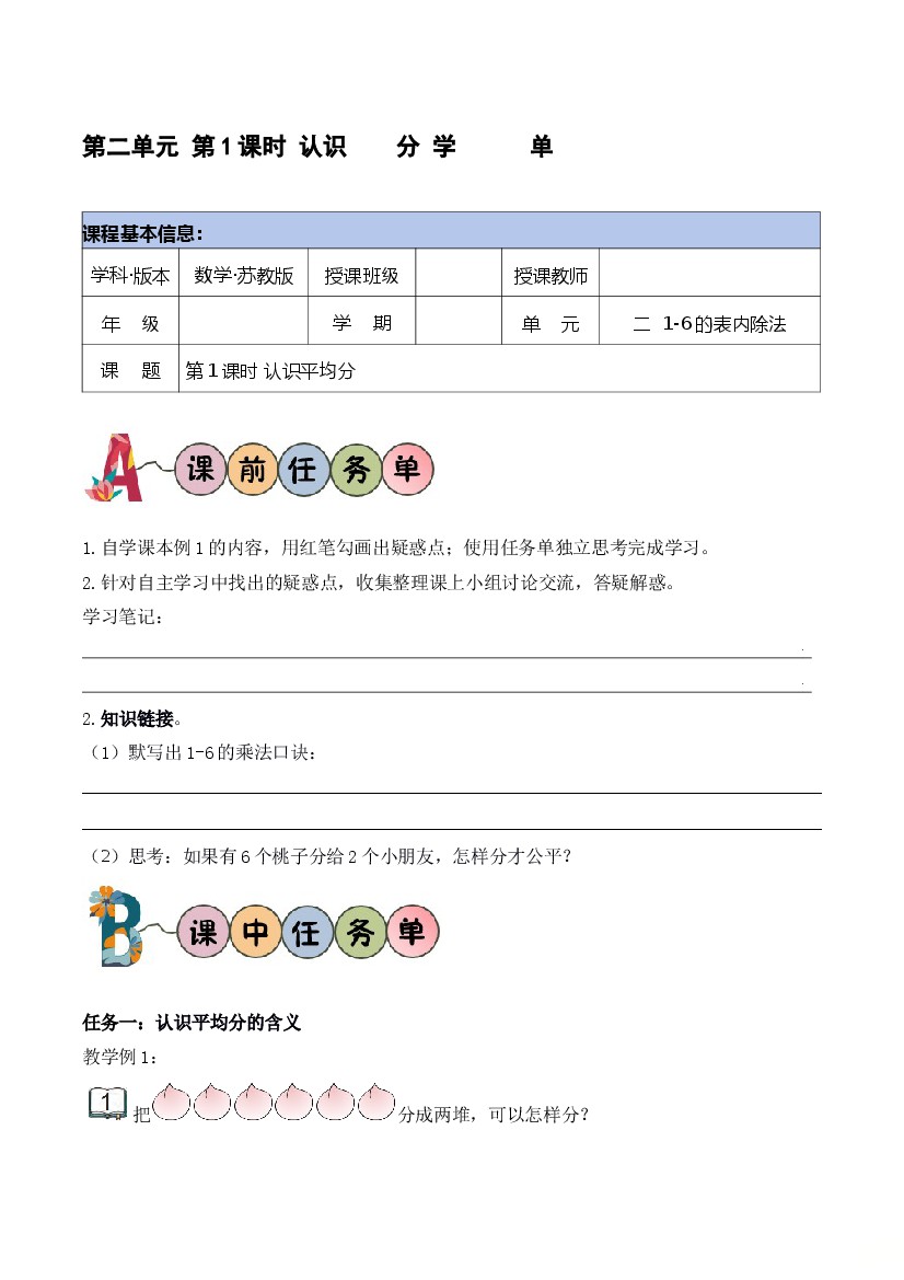 25秋二年级上册苏教版数学第二单元 第1课时 认识平均分(学习任务单)