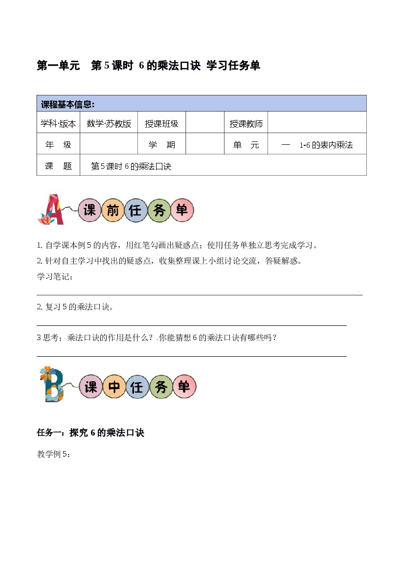 25秋二年级上册苏教版数学第一单元 第5课时 6的乘法口诀(学习任务单)