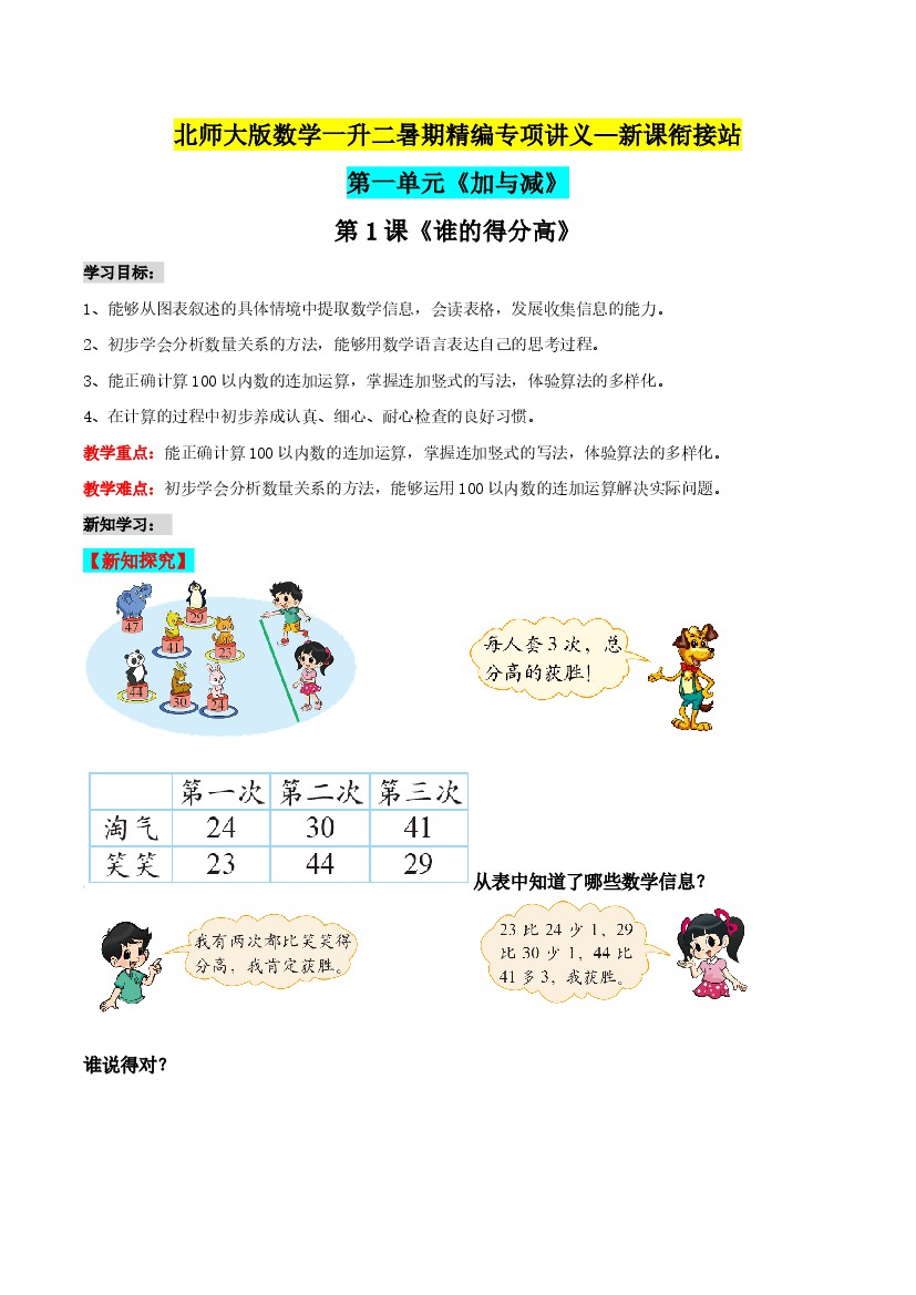 一升二数学暑假精品讲义(北师大版)第二部分:二年级上册新课衔接讲义——第一单元第1课《谁的得分高》(含答案)北师大版
