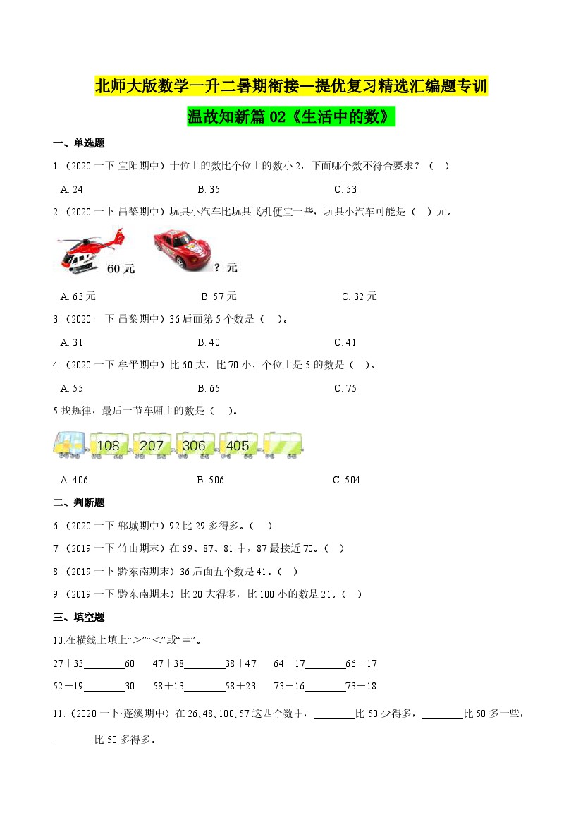 一升二数学暑假精品讲义(北师大版)第一部分:一年级下册知识复习精选题 ——02《生活中的数》(含答案)北师大版