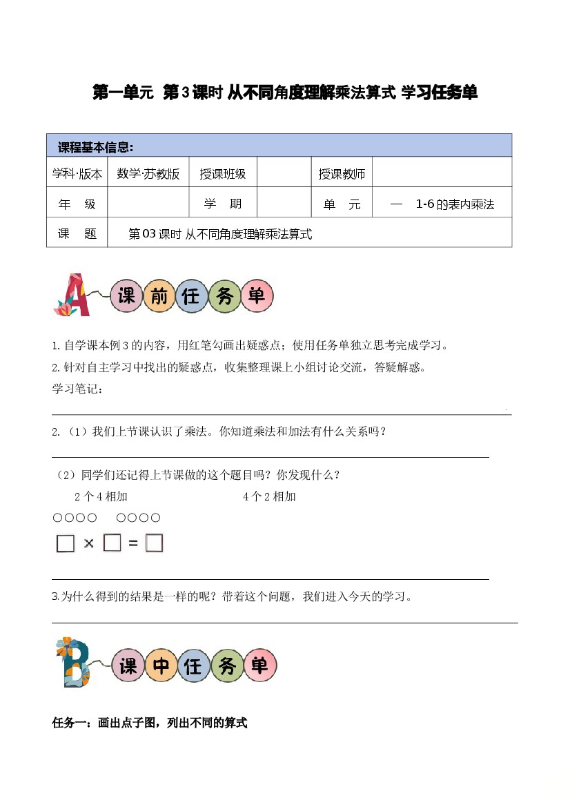 25秋二年级上册苏教版数学第一单元 第3课时 从不同角度理解乘法算式(学习任务单)