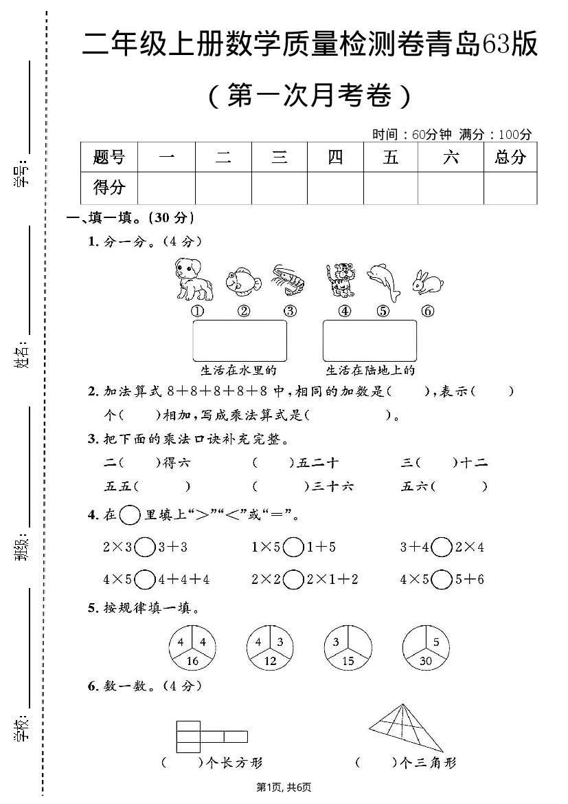 二年级(上)数学第一次月考测试卷《青岛63版》