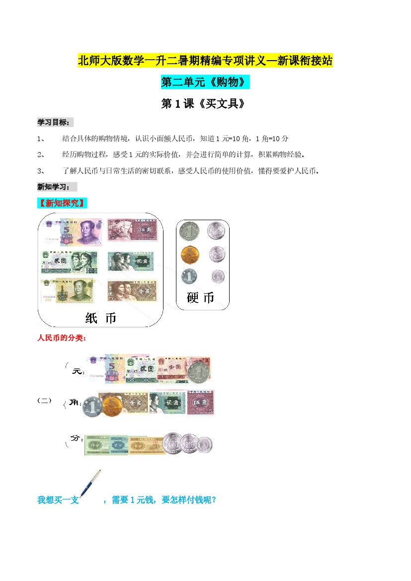 一升二数学暑假精品讲义(北师大版)第二部分:二年级上册新课衔接讲义——第二单元第1课《买文具》(含答案)北师大版