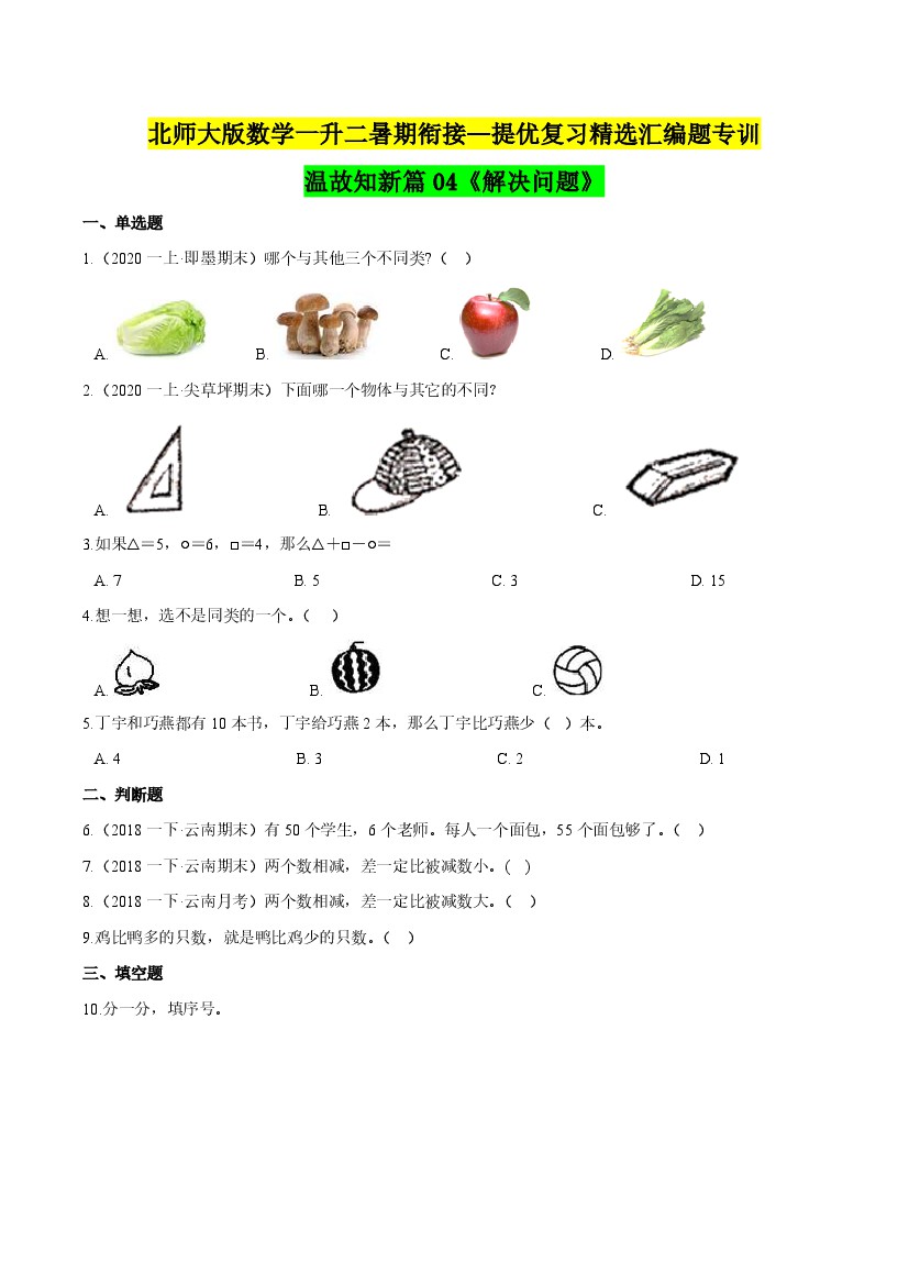 一升二数学暑假精品讲义(北师大版)第一部分:一年级下册知识复习精选题 ——04《解决问题》(含答案)北师大版