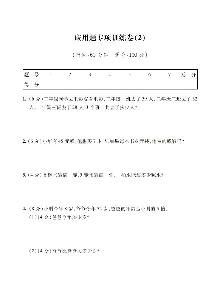 二年级(上)数学 应用题专项测试卷2《沪教版》