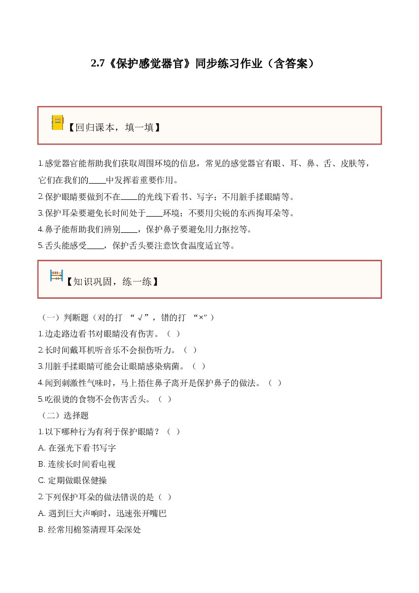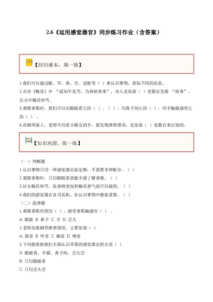 2025年秋新版粤教粤科版小学科学二年级上册(答案解析)第二单元 感觉器官(单元测试)