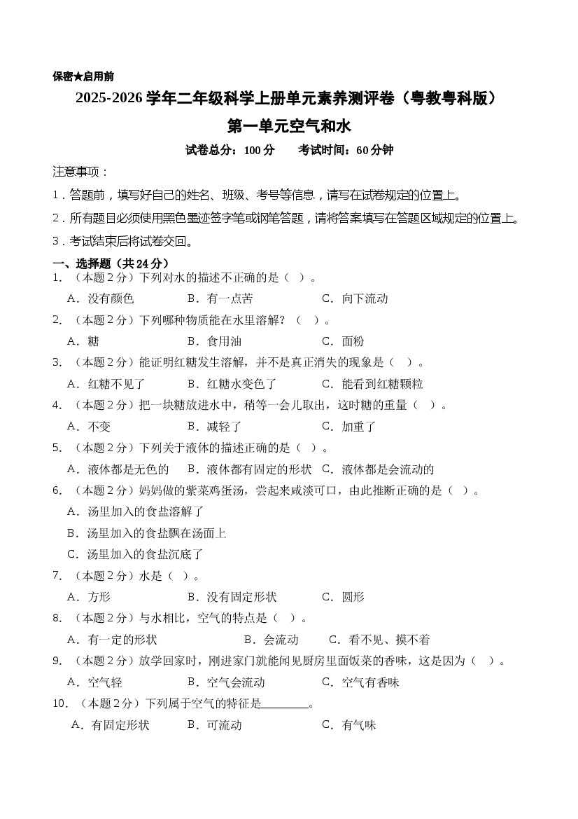 2025年秋新版粤教粤科版小学科学二年级上册第一单元空气和水(单元测试)科学 A4版